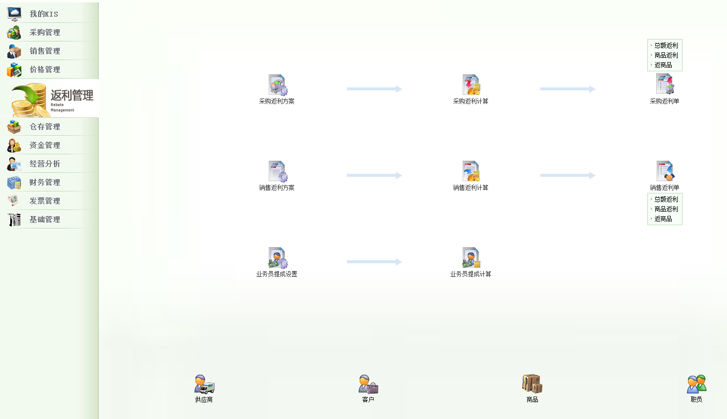 通过采购返利方案、销售返利方案以及业务员提成规则的设置,快速计算出各往来单位的返利金额或返回商品的数量,及业务员的业绩提成金额。全面规范企业在购销环节的返利、提成管理。
