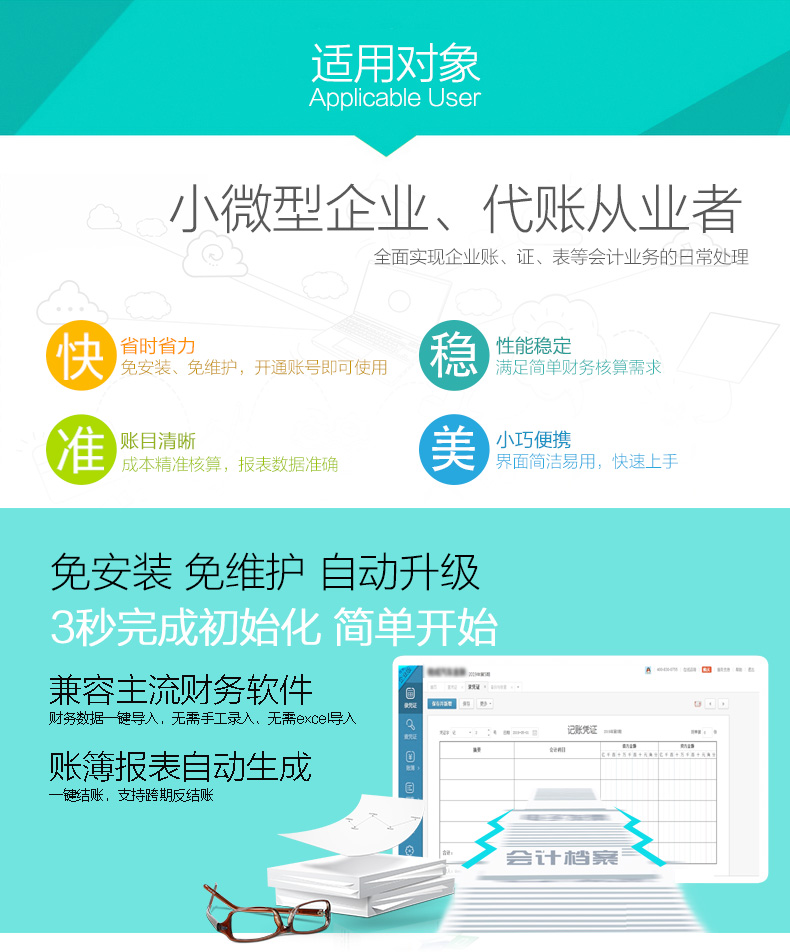 兼容主流财务软件,财务数据一键导入,无需手工录入、无需excel导入,简单高效