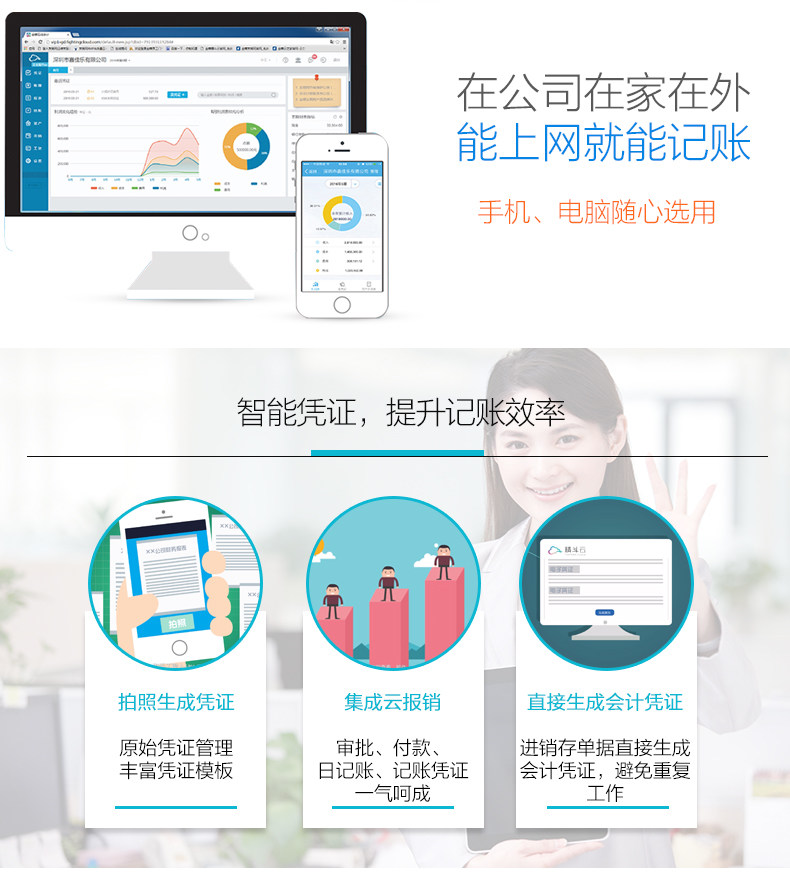 手机拍照,智能记账;丰富的凭证模板,快速录入凭证