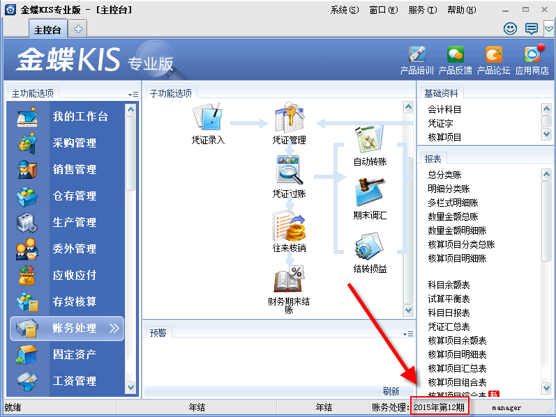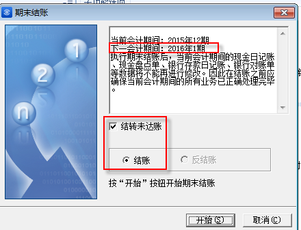 结账完成后,系统财务期间自动进下入一期,如2016年1月,并要求重新登录。