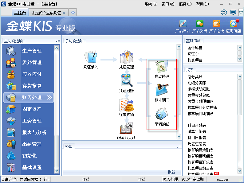 在软件中执行年结前,需要完成以下准备工作,以下以金蝶KIS专业版V12.0为例。(以下固定资产管理、出纳管理、工资管理等业务完成之间,没有必然的先后关系。)