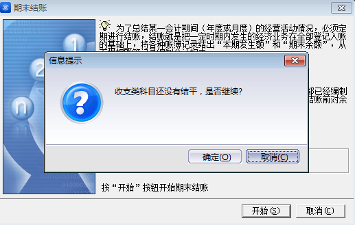 如果有收支类科目未结平,还有余额,则会提示: