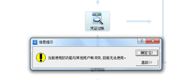如果在凭证过账或期末结账之前,系统检查到还存在其他用户或已经在使用的功能浆还没有释放出来,这时系统为确保过账、结账的工作能顺利完成,会提示用户以下信息: