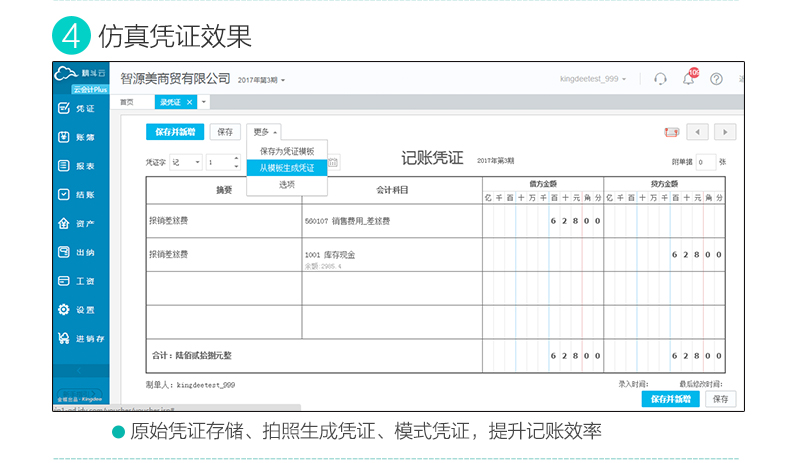 手机拍照,智能记账;丰富的凭证模板,快速录入凭证